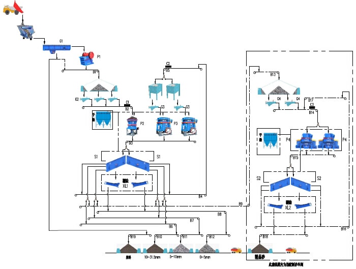 該系統(tǒng)示意工藝適用于時產(chǎn)800噸花崗巖、玄武巖類硬性物料的加工破碎,將經(jīng)過爆破處理或開挖、洞采的大塊毛料通過自卸車上 料至原料倉,經(jīng)過具有預(yù)篩分功能的棒條給料機均勻的供給顎式破碎機破碎,經(jīng)顎式破碎機破碎后的半成品物料通過皮帶機輸送給具 有中細碎功能的圓錐破碎機進行二次破碎,經(jīng)圓錐破碎機二次破碎后的混合成品骨料經(jīng)過皮帶機輸送至后續(xù)一篩車間進行分級篩分, 篩分將大于用戶需要的大顆粒物料再通過皮帶機輸送至細碎圓錐破碎機進行破碎,破碎后的物料也進入一篩車間進行篩分,滿足客戶 需要的合格成品通過皮帶機輸送至成品料倉,不符合要求的大顆粒再次返回細碎圓錐破碎機進行循環(huán)破碎。如果成品砂需要水洗也可 在一篩下面配置洗砂機用于成品砂的水洗。該系統(tǒng)的棒條給料機還具有預(yù)篩分功能,可以將原料中的細顆粒物料提前分離直接進入后 續(xù)的破碎設(shè)備,也可將原料中的泥土雜物作為棄料預(yù)先分離。