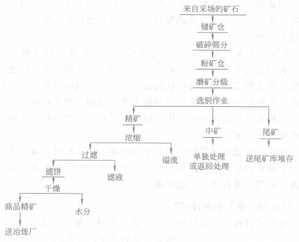 來自采場的礦石要經(jīng)過選礦過程的各個作業(yè),最后才能得到符合冶煉要求的精礦,如圖所示。