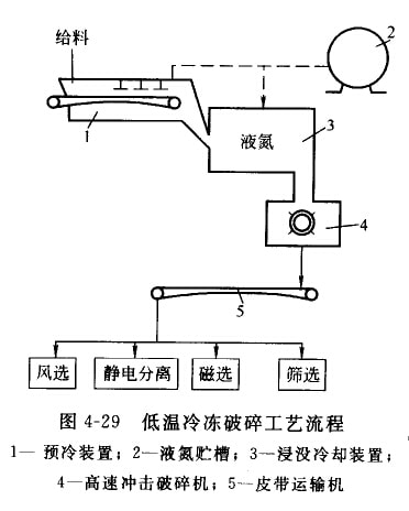 對(duì)于一些在常溫下難以破碎的固體廢物如汽車輪胎、包覆電線、廢家用電器等,可以利用其低溫變脆的性能而有效地施行破碎,也可 利用不同廢物脆化溫度的差異進(jìn)行在低溫下選擇性破碎。低溫破碎通常需要配置制冷系統(tǒng),液氮是常用的制冷劑,因液氮制冷效果好、 無毒、無爆炸性且貨源允足。但是所需的液氮量較大,是制備液氮需要消耗大量的能旦,故出于經(jīng)濟(jì)上的考慮,低溫破碎對(duì)象僅限于常 溫下破碎機(jī)回收成本高的合成材料,如橡膠和塑料。