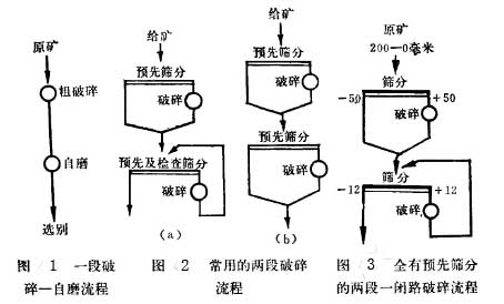 一般金屬礦選礦廠常采用二段或三段破碎篩分流程。個(gè)別大型選礦廠當(dāng)處理的原礦塊度大時(shí)有采用四段破碎流程的。近年來,由于自磨新工藝的日益發(fā)展,破碎篩分流程更為簡化了。