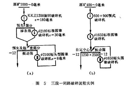 圖5(b)為某鉛鋅曠采用的第一段、第二段均不帶預(yù)先 篩分的三段一閉路破碎流程實(shí)例。