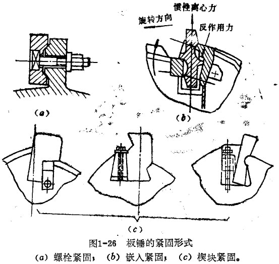 2.嵌入緊固法:扳錘從轉(zhuǎn)子側(cè)面軸向插入轉(zhuǎn)子的相應(yīng)槽孔內(nèi),為了防止軸向竄動,兩端采用壓板定位如圖1-26(5)。這種緊固方式利用板錘回轉(zhuǎn)時產(chǎn)生的離心慣性力與撞擊破碎時的反力自鎖緊固,易磨損件又便于更換。