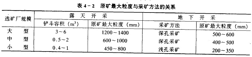 原礦最大耗度的確定:原礦最大粒度與采礦有關(guān),即與礦床賦存條件、礦山規(guī)模、采礦方法、裝運(yùn)設(shè)備等有關(guān)。它們之間的關(guān)系,如表4—2所示。