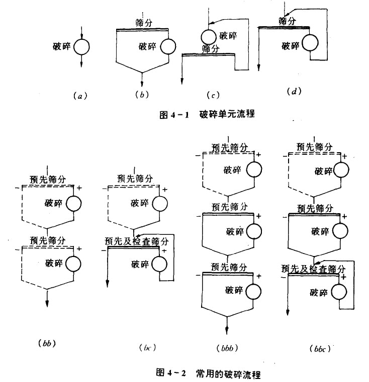常用破碎流程:破碎流程可能的類型很多,但根據(jù)預(yù)先篩分,檢查篩分設(shè)置條件,以及 實(shí)際生產(chǎn)中的原礦最大粒度和破碎最終產(chǎn)物粒度,常用的破碎流程有以下四種,如圖4—2所示。