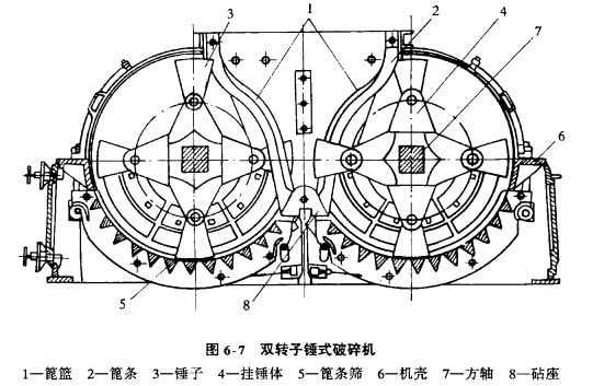 破碎機(jī)的進(jìn)料口設(shè)在機(jī)殼上方正中,進(jìn)料門下面,在兩轉(zhuǎn)子中間設(shè)有弓形篦籃1,篦籃由一組互相平行的弓形篦條2組成。各排錘子可以自由通過篦條之間的間隙。篦籃底部有凸起成馬鞍狀砧座8。