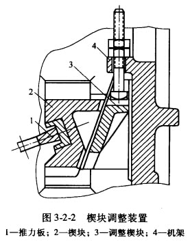 (2)楔塊調(diào)整。借助后推力板支座與機(jī)架后壁之間的兩個(gè)楔塊的相對(duì)移動(dòng)來(lái)實(shí)現(xiàn)破碎機(jī)排礦口的調(diào)整(圖3-2-2)。轉(zhuǎn)動(dòng)螺栓上的螺帽,使調(diào)整楔塊3沿著機(jī)架4的后壁做上升或下降移動(dòng),帶動(dòng)前楔塊2向前或向后移動(dòng);從而推動(dòng)報(bào)力板或動(dòng)領(lǐng),以達(dá)到排礦口調(diào)整的目的。此法可以達(dá)到無(wú)級(jí)調(diào)整,調(diào)整方便,節(jié)省時(shí)間,不必停車(chē)調(diào)整,但增加了機(jī)器的尺寸和質(zhì)量。中、小型額式破碎機(jī)常常采用這種調(diào)整裝置。