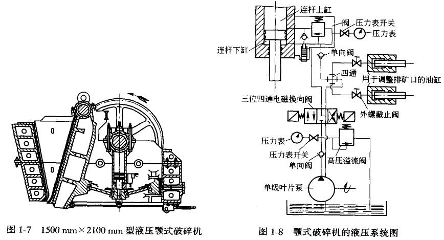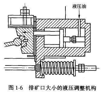 (3)液壓調(diào)整裝置。液壓調(diào)整裝置如圖1-6所示:在調(diào)整前,應(yīng)先松開(kāi)連接滑塊座與后機(jī)架間的螺帽及彈簧拉桿的螺帽,再啟動(dòng)液壓油泵,向油缸中注油,使油缸恬塞推動(dòng)滑塊座向前移動(dòng),然后在滑塊座與后機(jī)架間增減墊片,以達(dá)到調(diào)整排礦口的目的。調(diào)整完后將油缸中的油排出,擰緊滑塊座與后機(jī)架間的螺帽,并重新調(diào)整鎖緊彈簧的螺帽。排礦口調(diào)整的液壓系統(tǒng)見(jiàn)圖1-8。