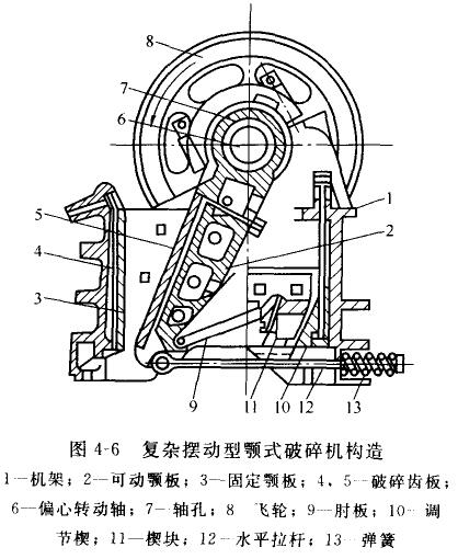 圖4-6為復(fù)雜擺動型顎式破碎機構(gòu)造。從構(gòu)造上來看,復(fù)雜擺動型顎式破碎機與簡單擺動型顎式破碎機的區(qū)別是少了一根動顎懸掛的心軸。動顎與連桿合為一個部件,沒有垂直連桿,軸板也只有一塊?梢,復(fù)雜擺動型顎式破碎機構(gòu)造簡單。但功顎的運動卻較簡單擺動型顎式破碎機復(fù)雜,動顎在水平方向上有擺動,同時在垂直方向上也有運動,是一種復(fù)雜運動,故稱復(fù)雜擺動型顎式破碎機。