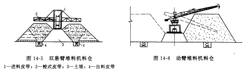(3)堆料式料倉(cāng)。堆料機(jī)是可以沿軌道移動(dòng),有懸臂擴(kuò)大堆料范圍的專用機(jī)械。雙懇臂堆料機(jī)如圖14—5所示。動(dòng)臂堆料機(jī)如圖14—6所示,動(dòng)臂可以旋轉(zhuǎn)和仰俯(變幅范圍在土16°之間),能適應(yīng)準(zhǔn)料位置和堆料高度的變化,避免骨料躍落過(guò)高,產(chǎn)生遜徑。