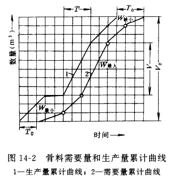 先根據(jù)混凝土澆筑計(jì)劃,繪出骨料需要量累計(jì)曲線,然后繪出骨料生產(chǎn)量累計(jì)曲線,圖14—2所示。