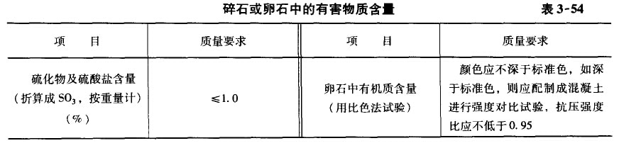 ⑦有害物質含量:碎石或卵石中的硫化物和硫酸鹽含量,以及卵石中有機雜質含量,應符合表3-54的規(guī)定。