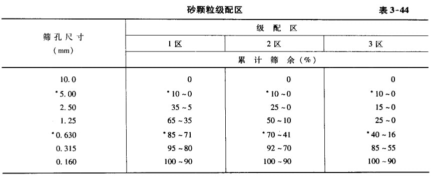 對于細度模數為3.7—1.6的砂,按0.630mm篩孔的累計篩余量(以重量百分率計)分成三個級配區(qū)。砂的顆粒級配,應處于表3 -44中的任何一個級配區(qū)以內。