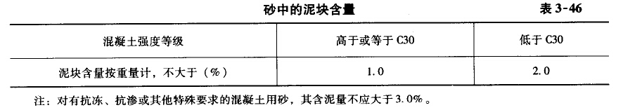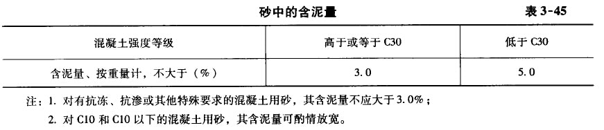 砂的含泥量(即粒徑小于0.080mm的塵屑、淤泥和豹土的總含量)應符合表3—45的規(guī)定。