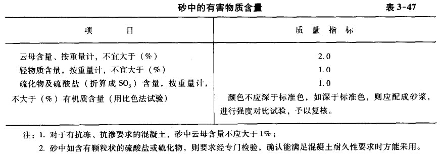 砂中如含有云母、輕物質(表觀密度小于2.0,如煤和褐煤等)、有機質、硫化物及硫酸鹽等有害質,其含量應符合表3—47的規(guī)定。