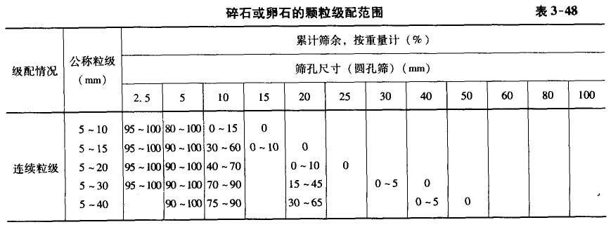 ①顆粒級配:碎石或卵石的顆粒級配.一船應符合表3-48的要求。