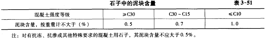 ③含泥量:碎石或卵石中的含泥量(即顆粒小于0.080Mm的塵屑、淤泥和教土的總含量,下同)應符合表3—50的規(guī)定,但不宜含 有塊狀熟土。
