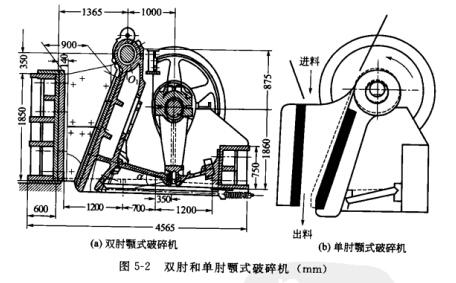 (3) 顎式破碎機(jī)。顎式破碎機(jī)是最為常見的粗碎機(jī),靠擠壓法破碎礦石。具有兩個基本類型:雙肘和單肘(如圖5-2所示)。它們的工作腔由定顎和動顎組成,上寬下窄。在動顎擺動下擠壓礦石,使其尺寸逐步減縮并由下部排出。