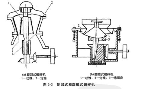 (4) 旋回式破碎機(jī)和圓錐式破碎機(jī)。旋回式和圓錐式破碎機(jī)的工作部分是固定的外錐和活動的內(nèi)錐,內(nèi)錐套裝在具有偏心的豎軸上,豎軸旋轉(zhuǎn)時內(nèi)錐在外錐內(nèi)做偏旋運動,物料在兩錐形成的環(huán)狀空間內(nèi)被擠壓和折斷。旋式破碎機(jī)是粗碎機(jī),因為破碎腔是環(huán)形的,生產(chǎn)能力大致是顎式破碎機(jī)的2. 5倍,是大型礦山常用的粗碎機(jī)。圓錐式破碎機(jī)是中碎和細(xì)碎用的破碎機(jī).如圖5- 3所示。