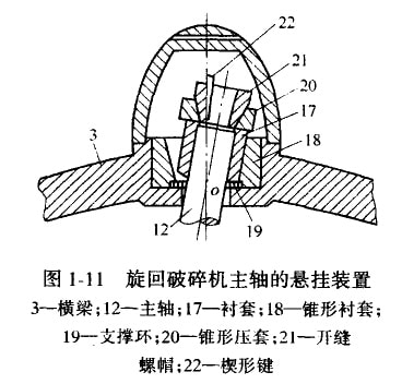 主軸12通過(guò)開縫錐形螺帽21、錐形壓套20、襯套17和支撐環(huán)19懸掛在橫梁上,并用楔形鍵22防止開縫錐形螺帽2l退扣。襯套17的錐形端支承在支撐環(huán)19上,而側(cè)面則支承在錐套18上:在破碎機(jī)運(yùn)轉(zhuǎn)時(shí),由于襯套17的下端與錐形襯套18的內(nèi)表面部是圓錐面,故能保證村套17沿支撐環(huán)19利錐形襯套18滾動(dòng).從而滿足了動(dòng)錐旋擺運(yùn)動(dòng)的要求。
