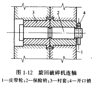 旋回破碎機(jī)的保險(xiǎn)裝置,主要是利用連接傳動(dòng)蝕和三角皮帶輪的聯(lián)細(xì)節(jié)土的保險(xiǎn)銷,當(dāng)過(guò)負(fù)荷時(shí)或破碎機(jī)中落人大塊非破碎物時(shí)(如電鏟齒),保險(xiǎn)銷即被招斷,達(dá)到保險(xiǎn)的日的。其裝置如圖1—12所示,它由四個(gè)保險(xiǎn)銷組成,裝在聯(lián)軸節(jié)上,用以連接傳動(dòng)軸和i角皮帶輪。