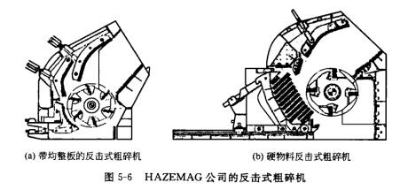 HAZEMAG公司開發(fā)了硬物料的反擊式粗碎機(jī)。這種破碎機(jī)的工作件都以耐磨性很高的高鉻合金制造,其硬度高達(dá)HRC60以上,并有一定的沖擊韌性。在結(jié)構(gòu)上也注重工作金屬的充分利用。型號(hào)APPKM1615的破碎機(jī)的最大進(jìn)料粒度為0.8m,出料粒度<56mm的占90%,破碎玄武石的生產(chǎn)能力可達(dá)350t/h。