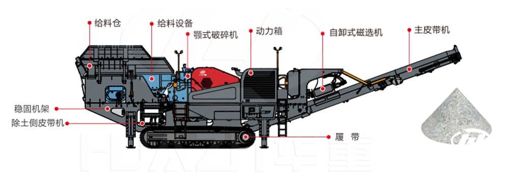 注::①關(guān)于破碎設(shè)備處理能力與石料硬度、給料粒度、出料粒度相關(guān)。②標(biāo)配:主皮帶和尾料皮帶配折疊技術(shù)、PLC+顯示器控制、除鐵器、無線遙控控制。③選配:全液壓驅(qū)動、返料系統(tǒng)、除塵器噴淋系統(tǒng)、柴油灌注泵、有線遙控、集中潤滑系統(tǒng)。④鑒于我公司技術(shù)不斷更新,技術(shù)參數(shù)變動恕不另行通知,具體參數(shù)以實物為準(zhǔn)。